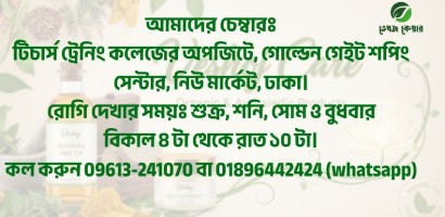 চেম্বার ঠিকানাঃ টিচার্স ট্রেনিং কলেজের অপজিটে, ২৮, গোল্ডেন গেইট শপিং সেন্টার, নিউ মার্কেট, ঢাকা ১২০৭।01896442424, 09613-241070রোগী দেখার সময়ঃ শুক্র,শনি, সোম ও বুধবার সকাল ১১ টা-দুপুর ০১টা এবং বিকেল ০৪টা থেকে রাত ১০ টা পর্যন্ত